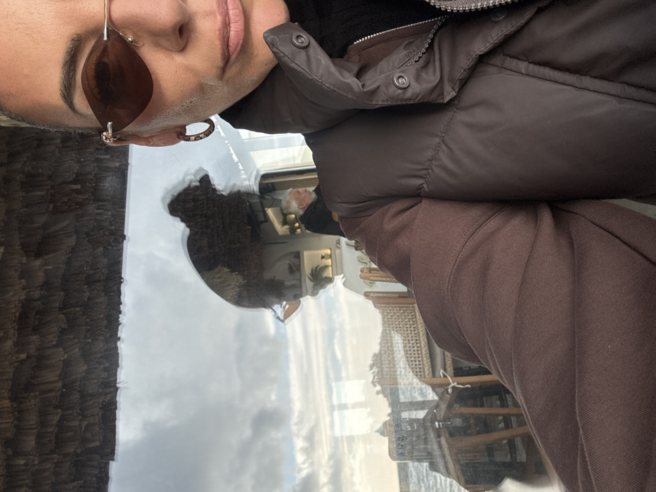 A partial view of an individual's right face and upper torso is captured in a window reflection within a coastal establishment in Petrovac na Moru, Montenegro. The individual wears brown rimless oval sunglasses, a black turtleneck, and a dark brown puffer vest over a brown long-sleeved top, with a golden-brown hoop earring on the visible ear. Reflected within the establishment, a grey-haired male with a beard is seated behind the foreground subject's arm, near a white counter adorned with decorative elements. A textured ceiling or overhead structure is also reflected. The external view through the window reveals an overcast sky above a body of water, featuring a distant landmass with a domed building and outdoor wooden furniture along the waterline.