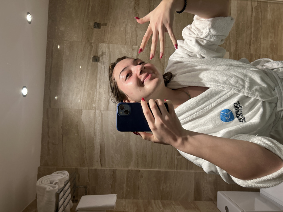 A young woman in a white robe takes a selfie in a bathroom with beige marble walls. She holds a blue smartphone and poses with one hand raised, displaying her red-spotted nails. The robe has a logo embroidered on the chest. A towel warmer with folded white towels is visible in the background, along with two downlights on the wall.