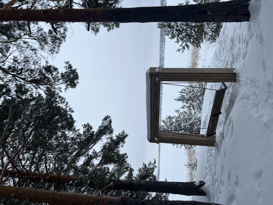 The scene depicts a snow-covered winter landscape in Votkinsk, Russia. In the immediate foreground, deep snow blankets the ground, with visible footprints forming a narrow path leading towards a wooden swing structure. This structure, centrally positioned, consists of four vertical wooden posts supporting a horizontal beam, all topped with a layer of snow. A two-seater wooden swing with a slatted back hangs from dark chains within the frame. Large pine trees with snow-dusted branches frame the image on the left and right, their dark trunks prominently featured. Beyond the swing, a vast, flat expanse of frozen, snow-covered water, likely the Votkinsk Reservoir, extends to the horizon under an overcast, light grey sky. A distant line of buildings or a settlement is faintly visible along the far shore. Closer to the water's edge, smaller snow-covered pine trees and some dried, reedy vegetation protrude from the snow. No individuals are present.