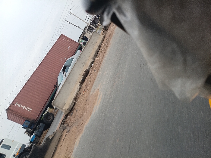 The image captures a roadside scene in Orifite, Nigeria, under an overcast sky. A white truck cab is visible in the upper left, attached to a long, red shipping container with the word "TRITON" inscribed vertically in white letters. To the right of the truck, a light-colored sedan is partially visible behind a damaged, light grey concrete barrier. This barrier spans horizontally across the mid-ground, separating a darker asphalt road in the foreground from the area containing the truck and car. A dirt and mud shoulder lies between the asphalt road and the concrete barrier. In the background to the right, utility poles with overhead wires and distant, indistinct structures are present. The perspective is from a low angle, with a blurred dark object and a small yellow element occupying the extreme lower right foreground. No individuals are visible.