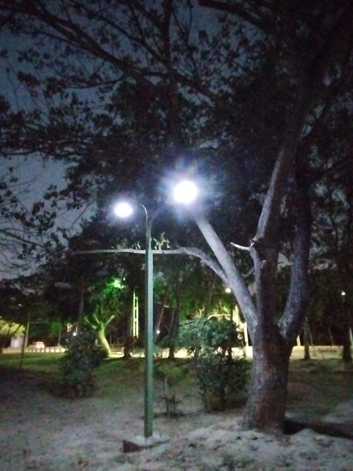 The image displays a nighttime scene within a public park or landscaped area, located in the city of Unknown, Unknown