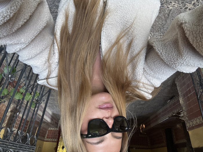 An upside-down selfie captures a woman with long blonde hair wearing black sunglasses and a cream-colored fuzzy jacket