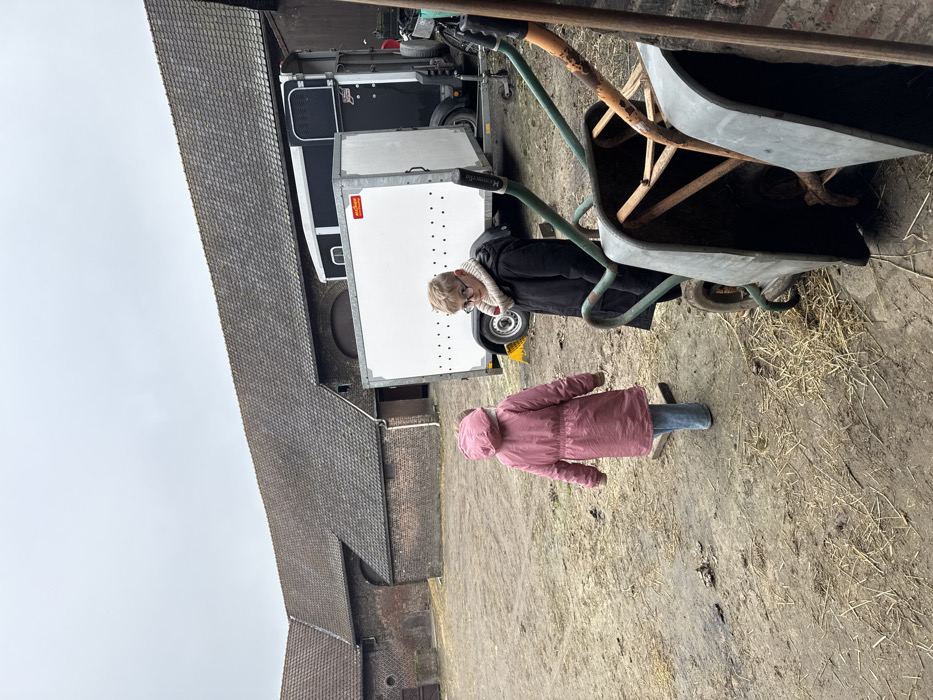 The image displays a muddy farmyard scene located in Estaimpuis, Belgium, under an overcast, grey sky. Two individuals, identified as children, are visible in the mid-ground. The person on the left is seen from behind, wearing a pink hooded parka and light blue jeans, walking towards the left side of the frame. The person on the right stands partially facing the camera, wearing a black long coat, a thick, light-colored knitted scarf, and dark-framed glasses, looking downwards and slightly to their left. The ground is composed of bare dirt and mud, with scattered patches of dry straw or hay. In the background, a long structure of old brick farm buildings with dark, tiled roofs extends across the frame. Two trailers are parked near these buildings: a white enclosed utility trailer with black ventilation holes visible along its side and yellow wheel chocks, and behind it, a darker-colored horse trailer. In the immediate foreground on the right, two wheelbarrows are partially visible, resting on their sides. One has green handles and a grey basin, while the other, positioned behind it, appears older with orange-brown handles.