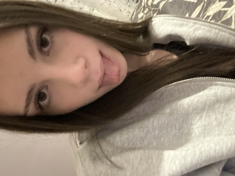 A young woman with brown hair and eyes poses closely, sticking out her tongue. She wears a light gray zip-up sweatshirt, partially open, revealing a glimpse of a black garment underneath. The background features a white surface with a subtle patterned design. The camera angle is slightly tilted, creating a dynamic and informal perspective.