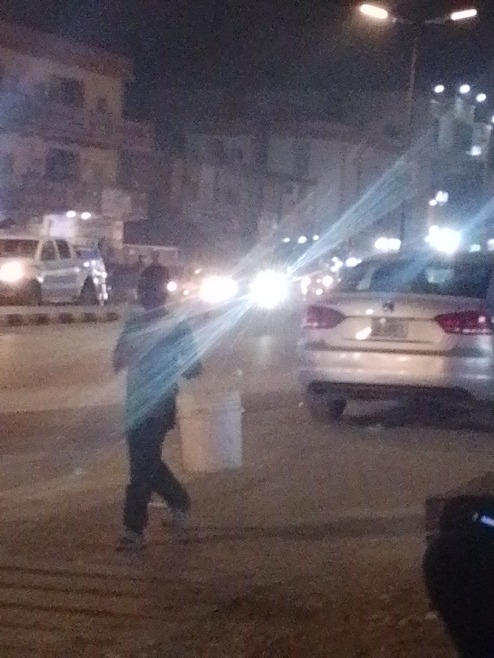 At night, a blurry image shows a street scene. Cars with headlights illuminate the scene. A person wearing a light-colored shirt and dark pants walks across the street. There's a white bucket near the person. Buildings are visible in the background. Bright lights from street lamps and cars create streaks of light in the image.