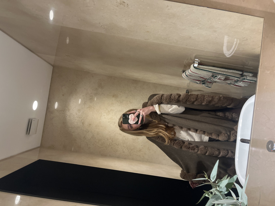 An individual is depicted taking a mirror selfie within a private washroom or bathroom, located in Naucalpan de Juárez, Mexico. The subject, appearing female, has long, light-brown hair and is wearing a light-colored, possibly cream, knitted sweater under a brown poncho or cape with brown fur trim along the edges. Multiple rings are visible on the fingers of the hand holding a black smartphone, which has a pink heart-shaped grip accessory affixed to its rear. A thin gold chain necklace and a white bracelet are also present. The lower portion of a white sink basin with a chrome faucet is visible at the bottom of the frame. To the right, a chrome towel rack holds a folded striped towel, predominantly off-white with red and green patterns. A plant with smooth green leaves is partially visible on the left, foregrounding the sink. The walls are finished in a light beige, textured stone or tile. The white ceiling, reflected in the mirror, contains recessed light fixtures and a single rectangular ventilation grate. A dark, vertical architectural panel is visible in the reflection on the far left.