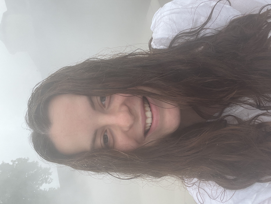 A single female subject is positioned centrally, facing the camera. She has long, dark brown hair, which appears wet with visible water droplets. Her facial expression is a broad smile, revealing her teeth, and her eyes are directed forward. She is wearing a white upper garment. The background is heavily obscured by dense fog or mist, rendering details indistinct. Faint outlines of tree branches are visible in the upper left, and an extremely blurred architectural structure with a rounded element is discernable in the upper right. The scene's pervasive mist and the subject's wet appearance are consistent with an outdoor location near the Gradierwerke (thorn houses) or Salinen (saltworks) in Bad Kreuznach, Germany, known for their brine mist production.