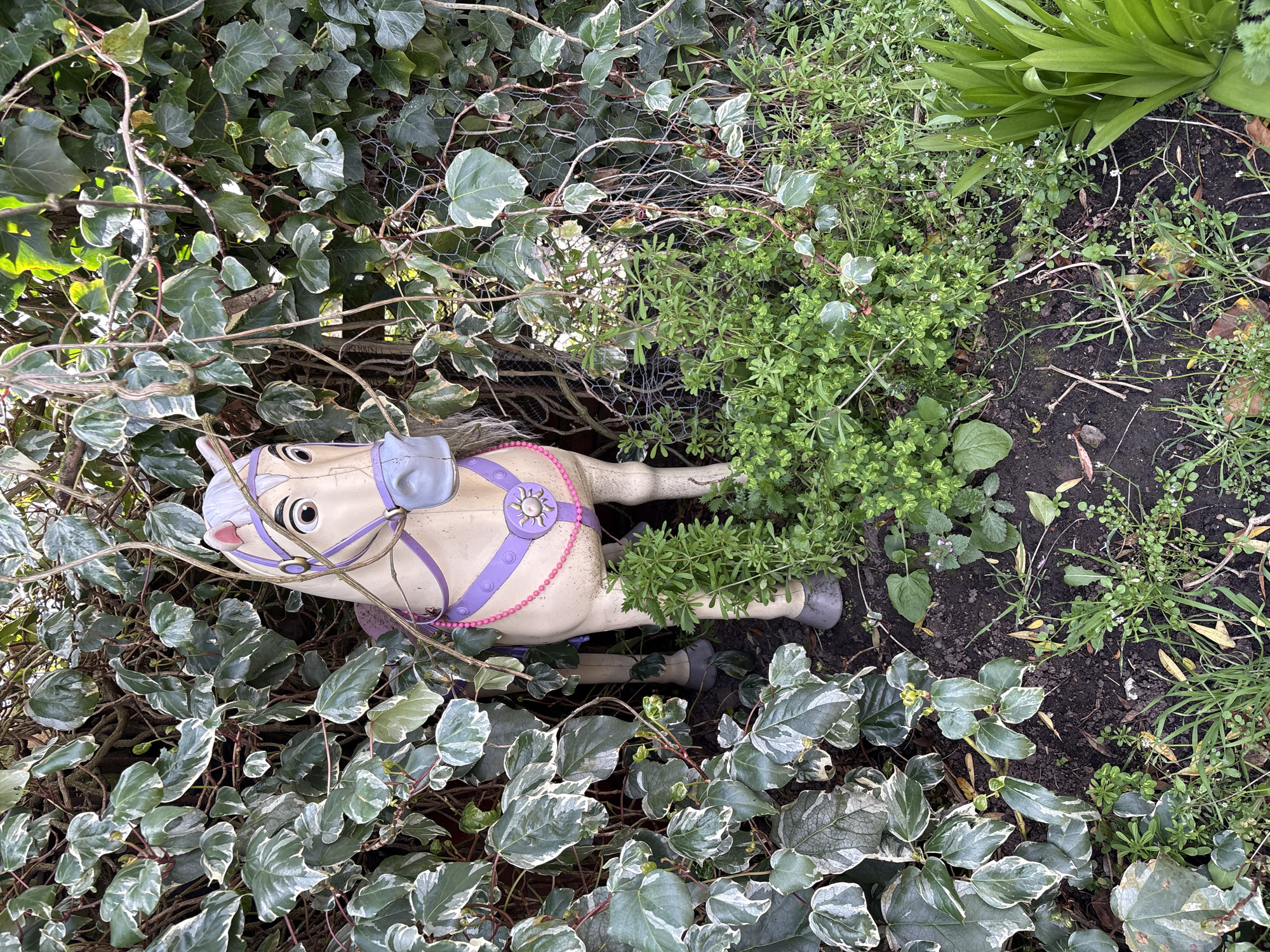 A child's toy horse, made of pale plastic with purple straps and bridle, lies horizontally in a bed of mixed vegetation. The vegetation consists of ivy with variegated green and white leaves, a patch of finer-leaved green plants, and other low-lying green foliage with brown soil visible underneath. The horse's head is oriented towards the left of the frame. The location is a garden setting, and assuming it is a residential garden in Pulverbatch, United Kingdom. No people, subjects, actions, or interactions are visible.
