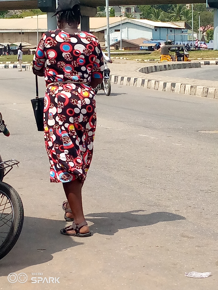 The image displays an urban street scene in Lokoja, Nigeria, under bright daylight. The primary subject, viewed from the back, is a person wearing a black cap, a colorful short-sleeved dress patterned with red, white, blue, and black circles and leopard print, and brown sandals. A black shoulder bag is carried on the left side, and a thin, light-colored belt is visible at the waist. The person stands on an asphalt road surface, partially obscured by a vehicle wheel and frame on the far left. Prominent shadows indicate direct sunlight. A white plastic wrapper is visible on the road in the mid-ground. To the right, a concrete curb defines a median strip. A motorcycle is observed in the mid-distance on the road, moving away from the viewer. An elevated concrete structure, likely an overpass or bridge, spans across the upper portion of the scene. In the background, beyond the median, various buildings are visible, including a prominent light-blue industrial-style building bearing the text "WAFO." Two yellow Keke Napeps (auto-rickshaws) are stationary further back near the median. Indistinct figures are present in the distant background, and green foliage with hills is visible on the horizon.