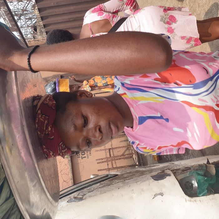 This image depicts a street scene in Onitsha, Nigeria. In the foreground, a young woman of African descent is centrally positioned, facing slightly left with her gaze directed downwards. She wears a pink t-shirt with multi-colored abstract patterns in white, blue, yellow, and red. On her head, she balances a large, circular metallic tray, cushioned by a red patterned fabric headwrap. Her right arm is raised, and a black beaded bracelet is visible on her right wrist. To the left of the main subject, a portion of a white, weathered vehicle, possibly a bus or truck, is visible, showing signs of peeling paint. In the midground, to the right of the main subject, another woman is partially seen from behind, wearing a light pink dress with a floral pattern of red roses. A dark strap from a bag crosses her back. Further back and to the right, a third woman is visible, wearing an orange patterned dress and also carrying an object on her head, which appears to be a yellow bucket topped with a dark bag. Her left arm is slightly raised. The background includes a brown corrugated metal fence and a building wall with faint white text, which includes partially legible words such as "NOTICE" and "TOILET," along with "AS..." and "TO...". Barbed wire is visible along the top of a structure in the background. The ground appears to be an unpaved or worn, light-colored surface. The scene is illuminated by bright daylight.