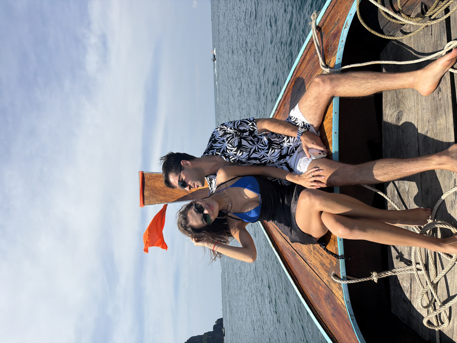 A couple lounges in a longtail boat, sunbathing. The man, clad in a black and white shirt and white shorts, casually places a hand on the woman's leg. She is wearing a blue bikini top and a black cover-up. Both are sporting sunglasses. The boat, crafted from wood and accented with blue trim, sits on calm turquoise water under a partly cloudy sky. The boat's orange flag adds a pop of color.