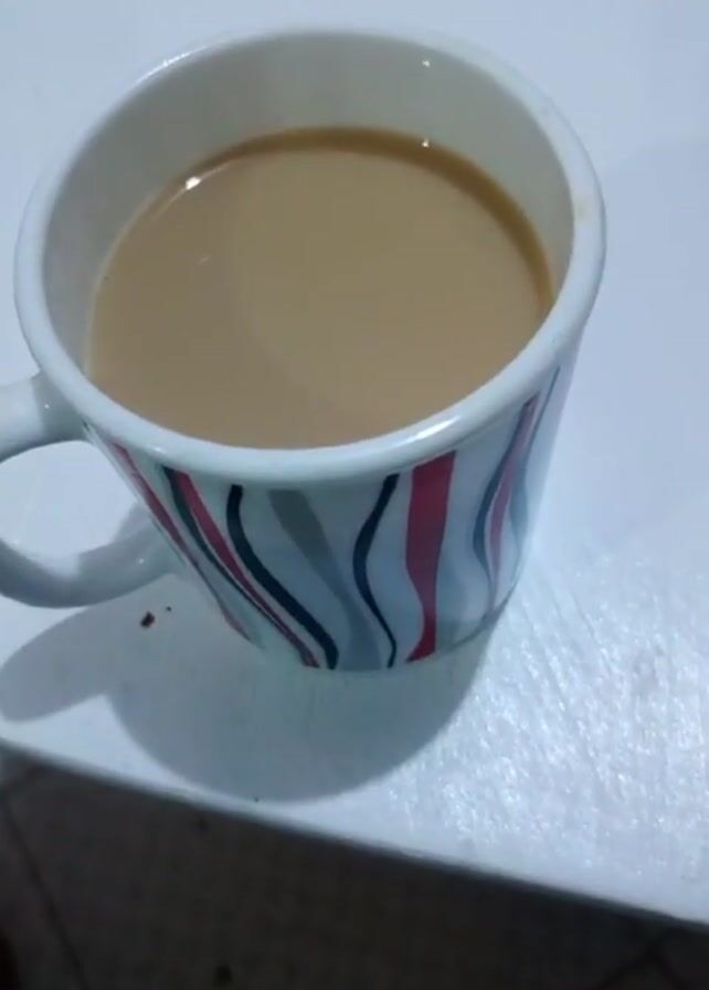 mug filled with a light brown beverage, likely coffee with milk or tea. The mug has a white interior and a striped exterior pattern of white, red, blue, and gray. It's placed on a white surface. There is a small dark crumb or particle on the surface near the mug. In the background, out of focus, are some cardboard packages. The camera angle shifts slightly during the short video.