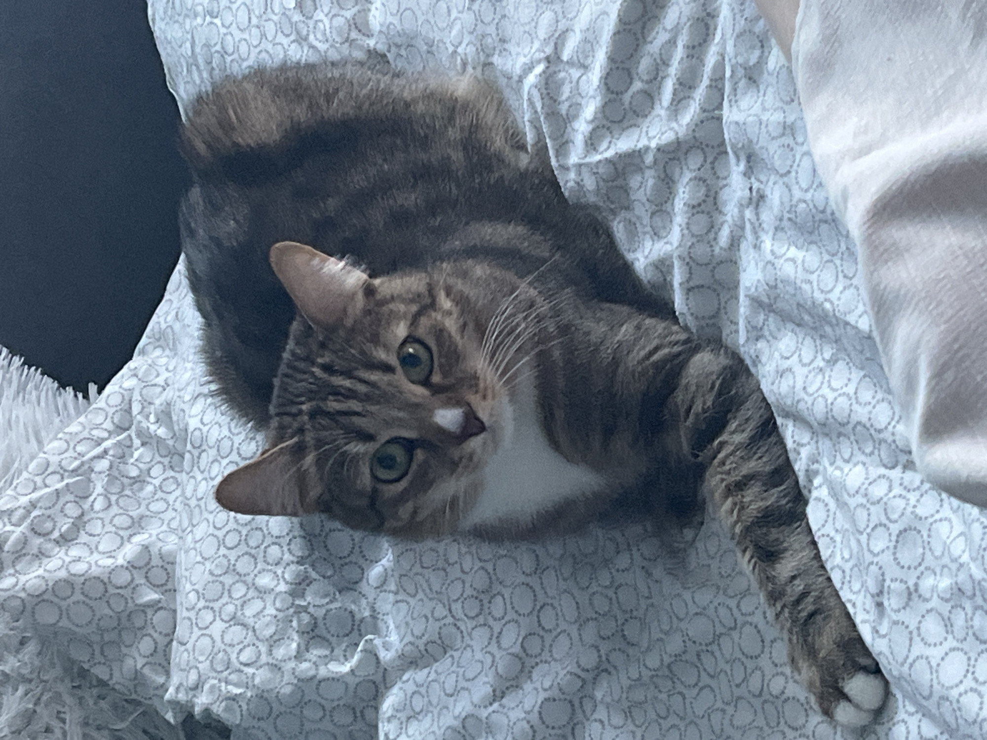 - "A tabby cat with green eyes and a white chest patch lies on a bed with a patterned white and gray sheet" by FM-MtN7u1, licensed under CC BY 4.0