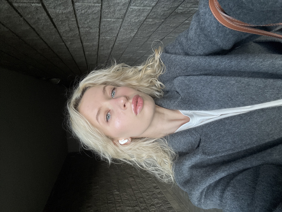 A forward-facing portrait depicts a young adult female positioned from the chest up, slightly off-center to the left. She possesses light blonde, wavy hair, blue eyes, and a fair complexion. She is wearing a white t-shirt beneath a dark grey, textured overcoat. A white earbud is visible in her left ear, accompanied by a small silver hoop earring. Her lips are slightly pursed and appear glossy with a light pink hue. The background consists of a dark grey, horizontally coursed brick or concrete block wall, extending into a darker, indistinct area towards the upper left. A brown leather bag strap is partially visible on the right side of the frame. The lighting indicates an overhead or front-left light source, illuminating the subject more brightly than the background. The environment suggests an enclosed or partially enclosed passage or underpass. No specific architectural landmarks are present to definitively identify the exact location within the city of Saint Petersburg, Russia.