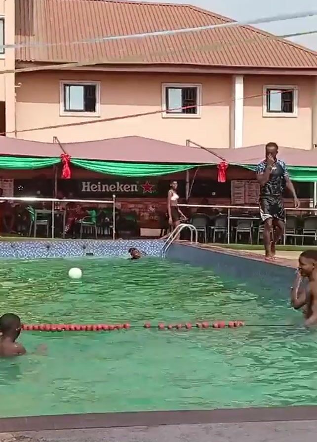 rectangular outdoor swimming pool. The water is green. There are several people in and around the pool. A group of boys are near the edge of the pool, partially in the water. There is a ball floating in the pool and a lane marker. In the background, a man in swim attire walks along the pool deck and a woman walks behind him. Behind the pool is a building with a brown roof. There is a covered area with a "Heineken" sign. People are sitting at tables underneath the covered area. The sky is bright, suggesting it is daytime.