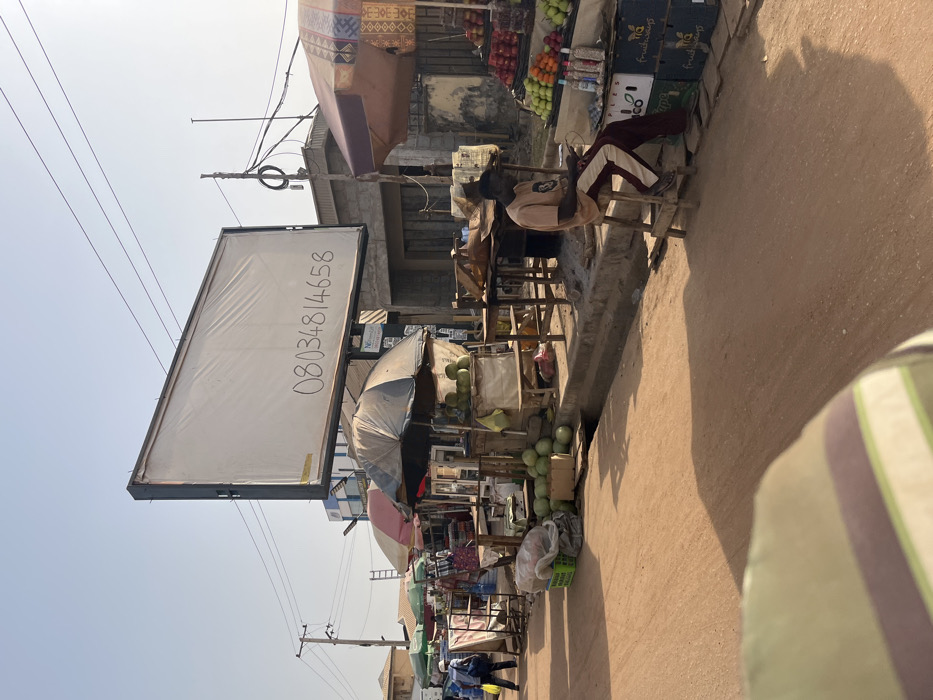 The image depicts an outdoor street market scene in Katambe, Nigeria, under clear skies and bright sunlight, casting distinct shadows