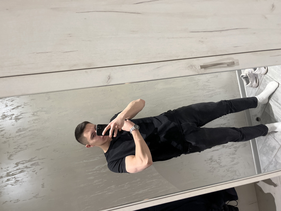 A young adult male, likely in Plovdiv, Bulgaria, is depicted taking a mirror selfie indoors. He stands centered, facing his reflection, holding a black smartphone in his right hand to capture the image. His left arm is bent, with his left hand gripping his right bicep or forearm. He wears a plain black short-sleeved t-shirt, dark grey or black slim-fit jeans, and white crew socks. A metallic wristwatch with a patterned bezel is visible on his left wrist. The immediate environment is an interior space with a large, full-length mirror reflecting a textured light grey wall on the left and a light wood-grained wardrobe door with a vertical silver handle on the right. The floor is covered with light grey tiles. A pair of white sneakers rests on the tiled floor to the right of the subject's feet, and a dark object is partially visible on the floor at the far left edge of the frame.