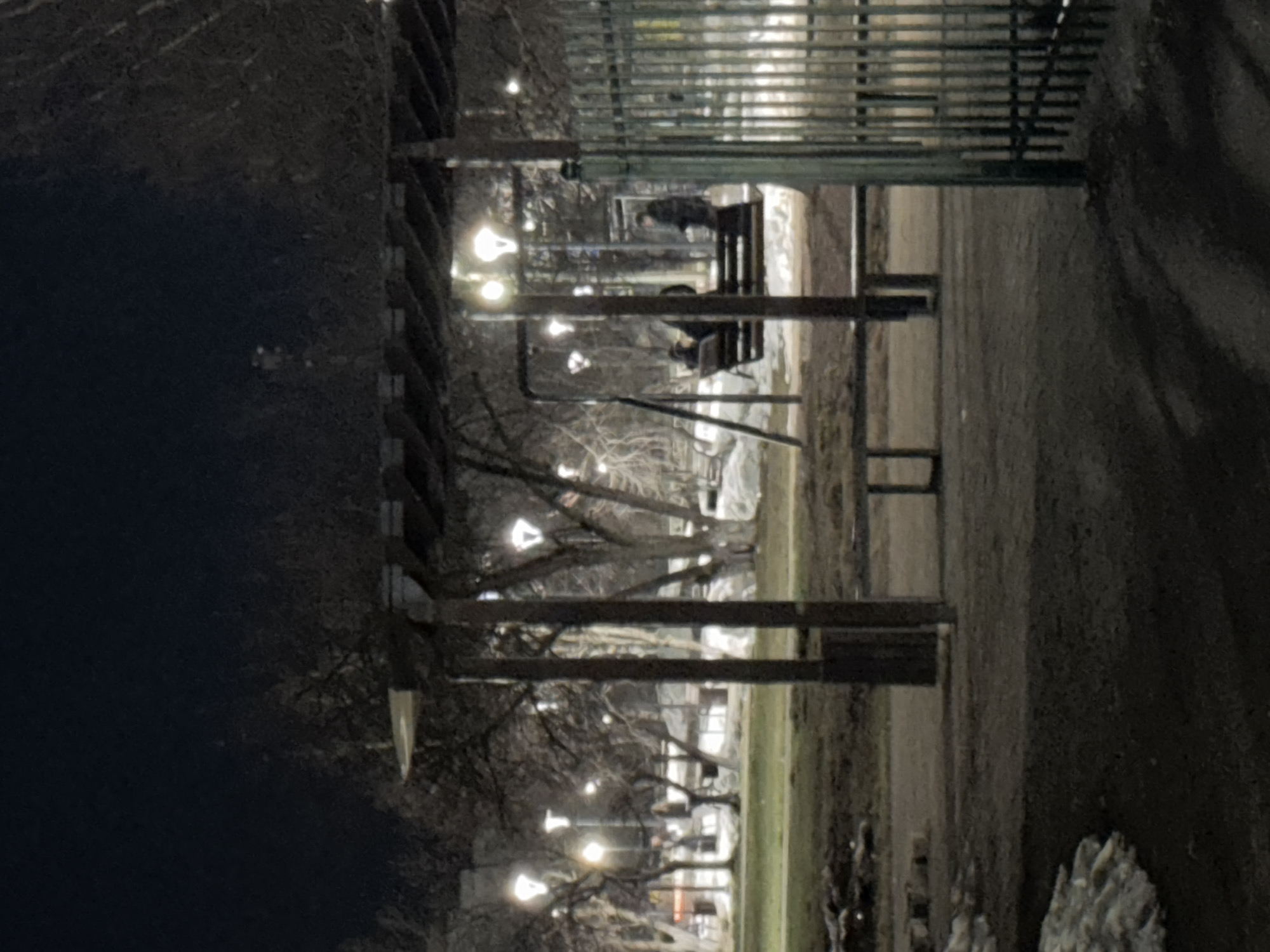 Here is a detailed description of the image: The image depicts a dimly lit park or public area at night in Chaikovsky, Russia. The scene is viewed through a metal fence or barrier. Several people are visible; some are sitting on benches. The park is illuminated by a series of streetlights that line a path. Bare trees are interspersed among the lights, indicating it might be late autumn or winter. Snow or ice patches can be seen on the ground.