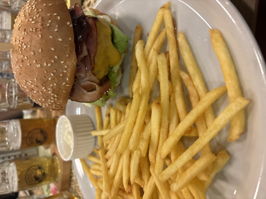 A sesame seed bun hamburger with bacon, cheese, and lettuce on a white plate. Accompanying the burger are fries and a small ramekin of white sauce. Several small glasses of what appears to be beer are on the left side of the plate. The plate is tilted in the shot, with the beer glasses on the lower-left side of the photo.