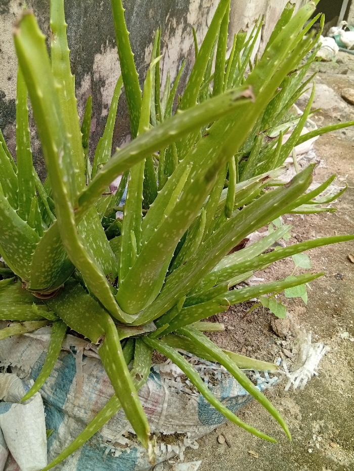 The image displays a dense cluster of mature Aloe vera plants situated outdoors in the city of Unknown, Unknown. The plants feature numerous thick, serrated, green succulent leaves with scattered white speckles, some exhibiting minor brown tips or damage. They are rooted in soil contained within and spilling from a partially visible, torn white and blue woven polypropylene bag, which rests on a light brown concrete surface. Behind the plants, a weathered, light-colored concrete wall is visible, showing significant dark staining and discoloration, particularly in the upper left quadrant. The ground directly surrounding the plant base consists of loose dirt and small white fibrous debris. No individuals are present, and no specific actions or interactions are depicted. The environment appears to be an urban outdoor setting.