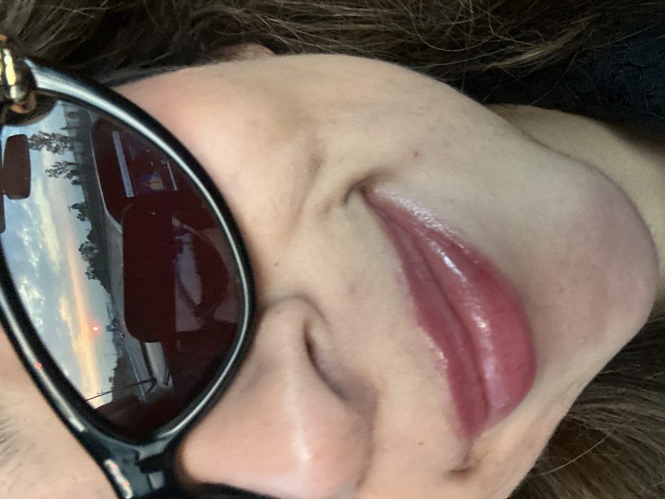 A person, seen from below in a close-up shot, rests on their side. A pair of black sunglasses frames the left side of the image, reflecting a roadside scene with trees and a sunset sky. The person's face is pale, with pink, glossy lips. Their nose is prominent, and the skin has a slightly oily sheen. Hints of brown hair frame the head. The overall impression is casual and intimate.