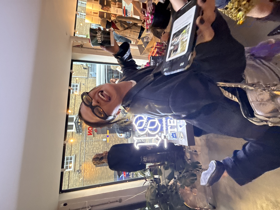 The image depicts an indoor commercial space, likely a pop-up event or bar, with a large window overlooking an urban street scene in a commercial district of London, United Kingdom. In the foreground, a person with dark hair, wearing black cat-eye glasses with yellow-tinted lenses and white earbuds, is captured mid-action, mouth open in an expression of laughter or shouting. They are dressed in a dark, possibly leather, jacket over a white top and metallic silver trousers, with a silver handbag resting on their hip. Their right hand is raised, holding a white cup branded "1800 TEQUILA," while their left hand extends a black tablet or e-reader towards the viewer, displaying an image and text. The person's left foot, wearing a dark shoe with a thick sole, is lifted, suggesting a dynamic pose. The interior background features a prominent blue neon sign spelling "1800 TEQUILA" on a table, next to a small bottle of 1800 Tequila. Potted green plants are visible on the left. To the right, a counter or bar area displays numerous cans or small bottles in a black tub, alongside cardboard boxes. A mannequin wearing a plaid jacket and a flat cap stands behind this counter. Fairy lights are strung along the top of the window frame. Through the large window, a street is visible with brick buildings, some featuring white-framed windows. A vehicle is partially seen on the street. A person with their back to the viewer, wearing a patterned head covering, stands outside near the window. A faint, reversed red neon sign (appearing as "MON") is reflected in the window. The overall setting is brightly lit indoors, contrasting with the dimmer natural light outside.