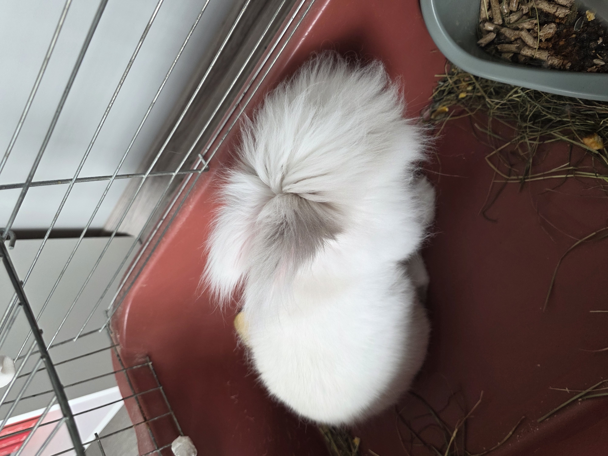 - "A white rabbit with grey markings is curled up in a red plastic cage tray next to a wire cage" by FM-SXaEj1, licensed under CC BY 4.0