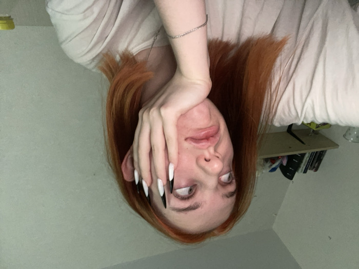 An upside-down image displays a fair-skinned person with auburn hair. They wear a light-colored top and a silver bracelet. Their face is partially obscured by their hand, revealing long, pointed nails painted white with black tips. Their eyes are rolled upward. A shelf with books and other items is visible in the background, along with a bedside table and part of a bed with white bedding.