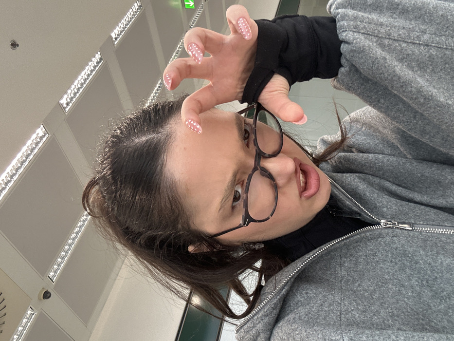 An individual with dark hair and mottled brown-framed glasses is depicted in a close-up, chest-up shot. The subject looks directly at the camera with an intense expression, mouth partially open revealing upper teeth, and furrowed brows. The left hand is raised and extended forward, fingers bent in a claw-like shape. The fingernails are painted light pink with white polka dots. The subject wears a grey zippered hooded sweatshirt over a black high-collared shirt, with a black thumb-hole sleeve visible on the left wrist. A silver-colored earring is present in the left ear. The indoor background features a grid-paneled ceiling with recessed rectangular fluorescent lighting fixtures. A small black security camera is mounted on the ceiling. A green square sign bearing a white downward arrow is visible in the upper right. This scene takes place in Ferno, Italy.