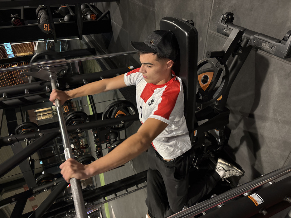 A young man in a black cap is at the gym, using a machine. He is wearing a white t-shirt with red accents and black pants. His hands grip the bar, and one foot is visible on the machine's footrest. The gym's interior is visible with weights and machinery. The photo is taken from an angle looking down at the subject.