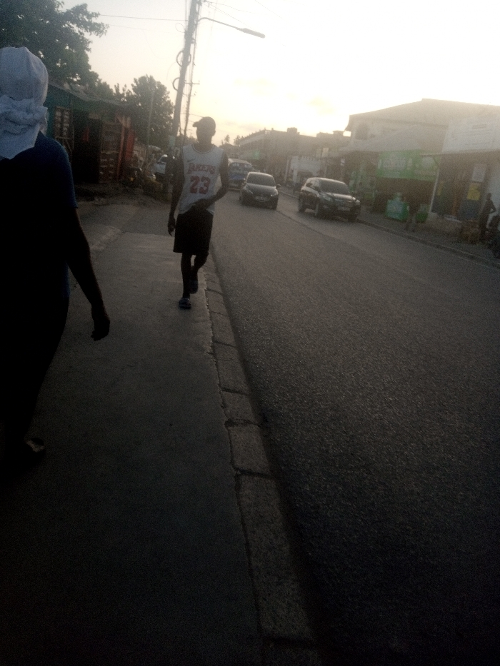 An outdoor street scene in Mtopanga ward, Kenya, is depicted during late afternoon or early evening, characterized by hazy, low-angle sunlight. The perspective is from a paved sidewalk. In the immediate foreground on the left, a partially visible individual, silhouetted, wearing a dark top and white head covering, walks away from the camera. Ahead of them, a male figure walks on the sidewalk towards the camera, wearing a white "LAKERS 23" basketball jersey, black shorts, and blue sandals. His face is obscured by shadow. To the right of the sidewalk, a paved asphalt road is present, separated by a concrete curb. Three vehicles are visible on the road, traveling away from the camera: a dark sedan in the mid-ground, followed by a dark SUV, and a blue vehicle partially obscured further back. A utility pole with a streetlight stands on the left side of the road. Low-rise buildings, some appearing as shops with metal facades, are visible behind the pedestrians on the left. Across the road on the right, a continuous row of multi-story commercial buildings, some with visible signage, are illuminated by the ambient light. The sky is light and hazy.