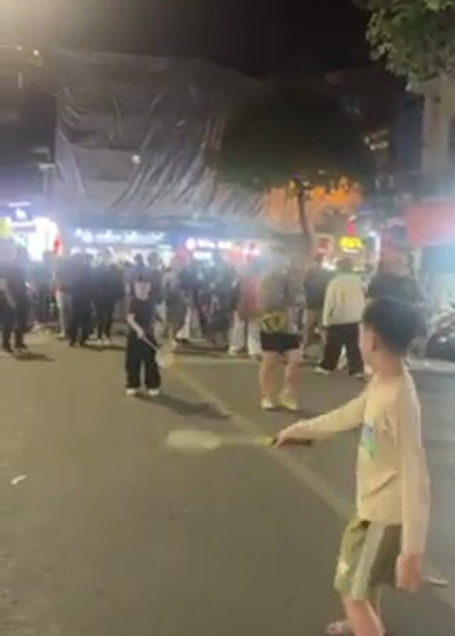 two boys playing badminton on a crowded street at night