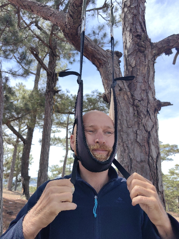 A man is outdoors, standing amidst a forest of pine trees, using a neck traction device. The device suspends his head, using straps connected to carabiners attached to tree branches overhead. He is fair-skinned, with a trimmed beard, and is wearing a dark blue zip-up jacket. The background shows a partly cloudy sky and a hilly landscape in the distance.
