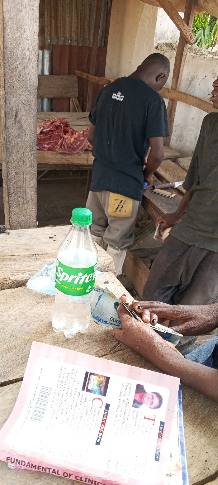 A table contains a bottle of Sprite, Nigerian Naira banknotes, and a textbook titled "Fundamental of Clinical." In the background, two men are at a butcher shop with meat displayed on a wooden table. One man is cutting meat with a knife. The man wears pants with "7L" on the pocket. The scene appears to be a transaction at the butcher shop where someone is paying with cash.