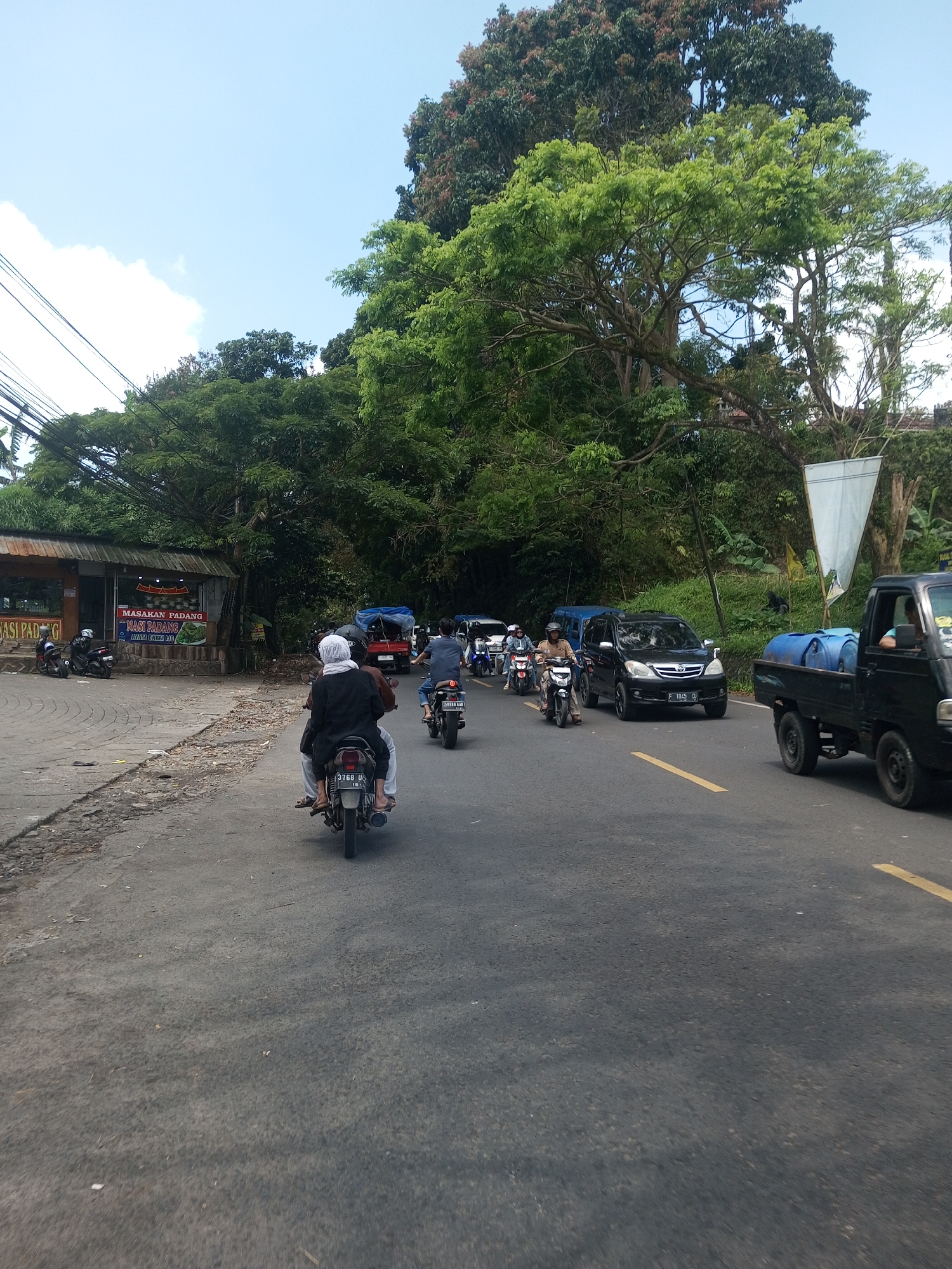 The image depicts a road in a tropical location, possibly in or around the city of Nawng Hkar, Myanmar, though this location is uncertain. Several vehicles and motorcycles are moving on the asphalt road. A black car and a small black truck with blue barrels in the back are prominent. In the foreground, a motorcycle carries two people, one wearing a white head covering. Other motorcycles and cars are visible further ahead. A roadside restaurant or shop is on the left side of the road, with a sign advertising "NASI PADANG". Lush green trees dominate the background, with a bright sky visible above. A road-side pole with white flags is visible on the right. A single yellow line is seen on the asphalt road.