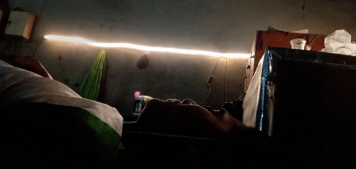 The scene is an interior view within a dimly lit room in Sumput, Indonesia. A horizontal strip light, possibly fluorescent, emits a warm glow across the upper section of a dark wall. Two individuals are present, both appearing to be at rest. On the left, a person is partially visible, clad in a white garment with a green stripe, reclining against an unseen surface. To their right, a green, folded umbrella leans against the wall. In the center, a second individual lies supine, head in profile facing upwards, exposing their bare chest and shoulder. Near their head, a small object, possibly a phone or bottle with a pink cap, rests on a surface. Above this individual, a dark, irregularly shaped object hangs from the wall, and an electrical cord with a dark plug extends downwards. On the far right, a large, dark rectangular object, possibly a covered appliance or piece of furniture, is positioned in the foreground. Behind it, a reddish-brown wooden cabinet is visible, with a clear plastic cup and crumpled white material placed on its top surface. An additional light-colored rectangular object, possibly a cabinet or shelf, is mounted on the upper left wall. The environment is utilitarian, with dark walls and minimal decor.