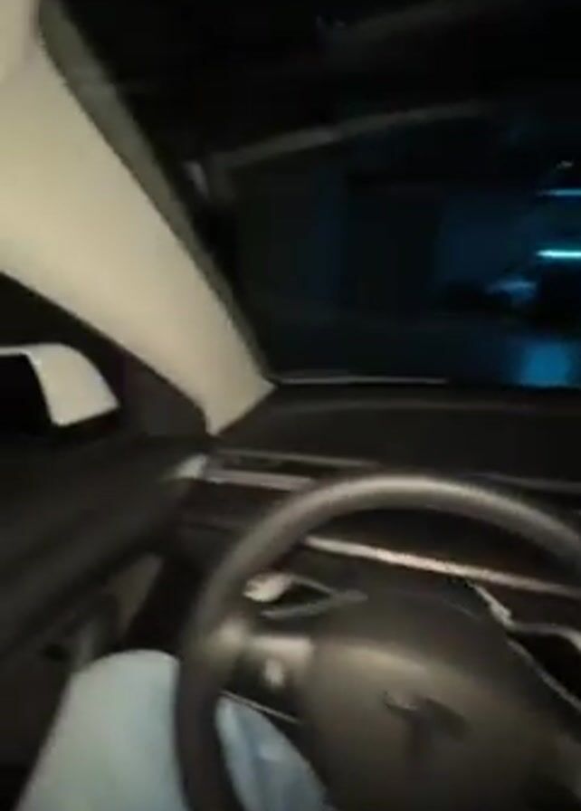 The video starts inside of a Tesla Model 3 parked in an underground parking garage