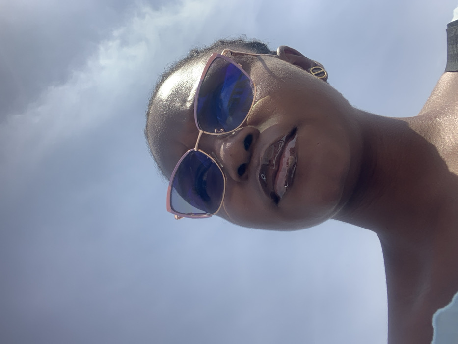 The image is a low-angle, head-and-shoulders portrait of an individual with dark skin. The subject wears light-framed, cat-eye sunglasses with dark, reflective lenses. Their lips are coated with a clear or light-toned gloss. A stud piercing is present on the left nostril, and a gold-colored earring, designed with two interlocking letters (possibly 'C' or 'D'), adorns the right earlobe. Partially visible clothing includes a light-colored garment on the subject's left shoulder/chest area and a dark strap on their right shoulder. The background consists entirely of a clear blue sky with some sparse white clouds, indicating an outdoor daytime setting with direct sunlight. The image itself contains no visual cues to confirm a specific location within the city of Gombe, Nigeria.
