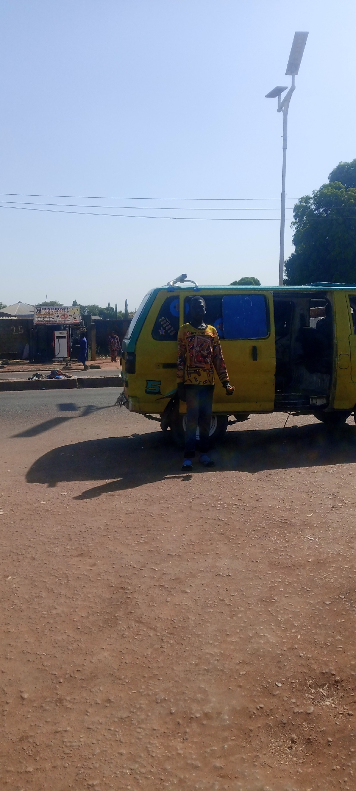 The image displays an outdoor street scene in Sabon Tasha, Nigeria, under a clear, light blue sky with overhead sunlight. In the foreground, a rough, reddish-brown dirt surface covers the lower portion of the frame. Long, dark shadows are cast towards the viewer by a person and a vehicle, indicating strong illumination from above. A dark-skinned male subject stands in the middle ground, positioned to the right of a yellow commercial van. He wears a long-sleeved, multi-colored shirt featuring yellow, red, black, and white patterns and text, dark blue trousers, and dark blue sandals. His right hand is holding a small, dark object. The yellow van, possibly a passenger shuttle, has blue-painted window areas on its side. The passenger-side sliding door is open, revealing a dark interior. A white roof rack is mounted on top, and the number "5" is painted in black on the lower rear side of the vehicle. Text, including "JUBILATE," is visible on a rear window. Across a dark grey paved road in the background, a row of single-story buildings is visible. One structure prominently features a sign for "CENTURY 25" and is associated with a red and white fuel pump station. Two additional human figures are discernible on the far side of the road; one in blue clothing near the fuel pump, and another in patterned attire further to the right. Green foliage from trees and bushes extends behind the buildings, particularly on the right side. A tall, grey pole with an integrated solar panel and an LED street light fixture is visible on the far right, extending into the sky. Thin, dark power lines traverse horizontally across the upper middle ground.