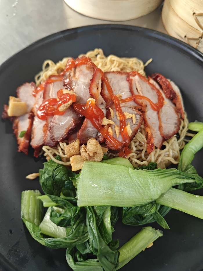 A close-up shot shows a black plate filled with Cantonese roasted pork (char siu) noodles
