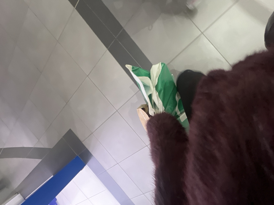 A first-person perspective shows a person wearing a fuzzy, dark purple coat. They hold a green and white striped plastic bag, likely from a store, with a tan paper bag inside. The ground consists of light grey tiles with darker grey and blue accents. The floor appears clean and well-maintained.