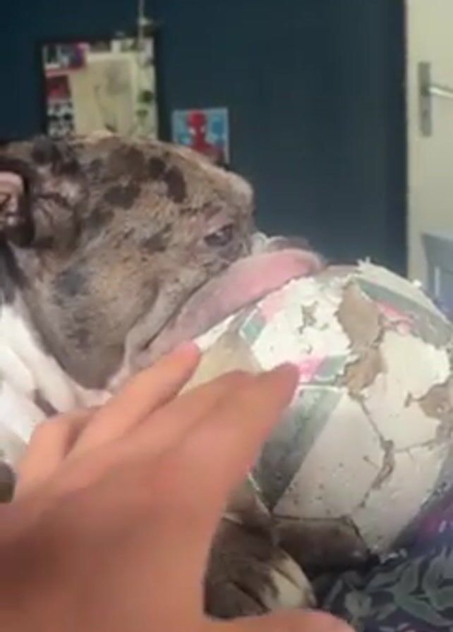 A close-up shot shows a mottled brown-and-white English Bulldog lying on a bed with a floral-patterned comforter. It is licking a worn, patched-up soccer ball. A person's hand approaches the ball, and the dog growls and snaps at the person, protecting its toy. The background includes a dark blue wall with a framed picture and hanging vines.