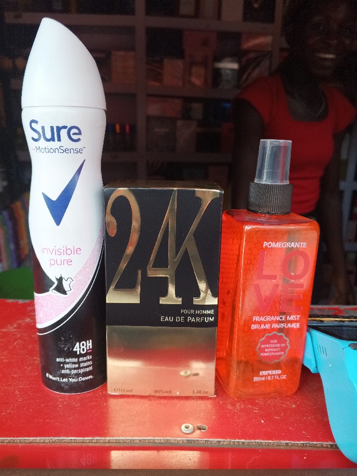 The image depicts a retail display within a shop in Nsukka, Nigeria. Three consumer products are arranged on a red, slightly textured surface in the foreground. From left to right, these include a white Sure MotionSense "invisible pure" anti-perspirant spray bottle (48h, anti-white marks + yellow stains), a black and gold rectangular box labeled "24K POUR HOMME EAU DE PARFUM," and an orange translucent bottle of "POMEGRANTE LOVE FRAGRANCE MIST BRUME PARFUMÉE" (IMPERIO, 260ml) with a black spray pump. In the blurred background, a dark-skinned individual wearing a red top is partially visible behind the products, smiling. Behind this individual and the items, shelves stocked with various packaged goods are discernible, consistent with a commercial establishment. A partial light blue object is visible on the far right of the red display surface.