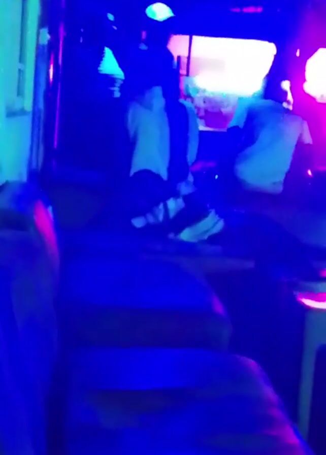 interior of what appears to be a bar or lounge, illuminated by blue and pink lights. In the background, three individuals are sitting on a bench, partially obscured. One person is wearing a white shirt and black shorts with white and black sneakers. Another person wears a light-colored shirt. The rest are silhouetted. In the foreground, there is a blue cushioned seating area, out of focus. The video is shaky and the focus is soft.
