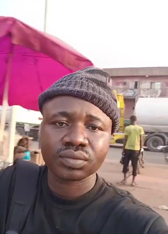 man with a mustache wearing a gray and black striped beanie and a black T-shirt, looking directly at the camera. He has a black backpack slung over his left shoulder. The background appears to be a busy roadside scene. We see trucks, parked motorcycles, market stalls covered with umbrellas, and several people walking around. There's a building with multiple stories visible in the background, and the ground appears to be dirt or dust covered. The light suggests it's daytime. The man is standing still while holding the camera.