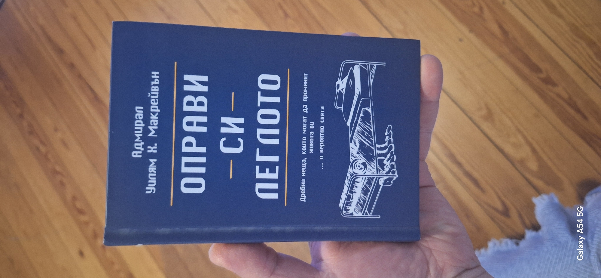 The image displays a dark blue hardcover book, identified as a Bulgarian edition of "Make Your Bed" by Admiral William H. McRaven, held in a human hand. The book's cover features white Cyrillic text: "Адмирал Уилям Х. Макрейвън" (Admiral William H. McRaven) at the top, a bold central title "ОПРАВИ – СИ – ЛЕГЛОТО" (Make Your Bed), and smaller text below stating "Дребни неща, които могат да променят живота ви ... и вероятно света" (Little things that can change your life ... and probably the world). An outline illustration of a neatly made bed with a pillow occupies the lower portion of the cover. A light-skinned left hand grips the book, with the thumb visible on the left side and fingers supporting the bottom. A light-colored, textured fabric, likely a sleeve cuff, is partially visible at the bottom left. The background consists of a light brown wooden floor or surface with visible grain, featuring planks oriented diagonally. The bottom left corner of the image is marked with "Galaxy A54 5G." The scene is observed in Hamburg, Germany.