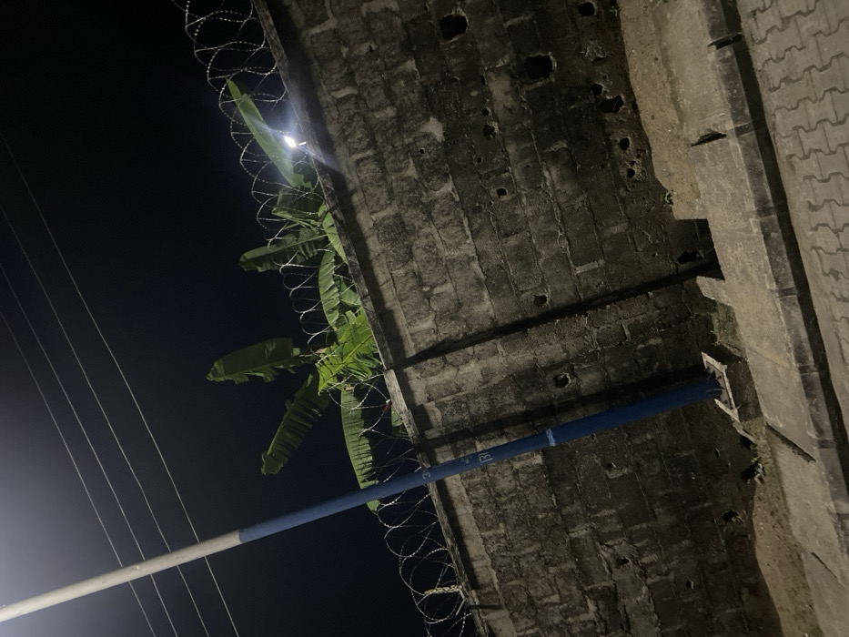 A low-angle shot captures a dimly lit, weathered brick wall topped with barbed wire, juxtaposed with a dark, possibly nighttime sky. A vibrant green banana tree sprouts alongside the wall, its large leaves contrasting against the somber background. A blue and white horizontal pole extends across the lower portion of the frame, adding a linear element. Power lines are visible in the distance. The wall is marked with holes and variations in texture.