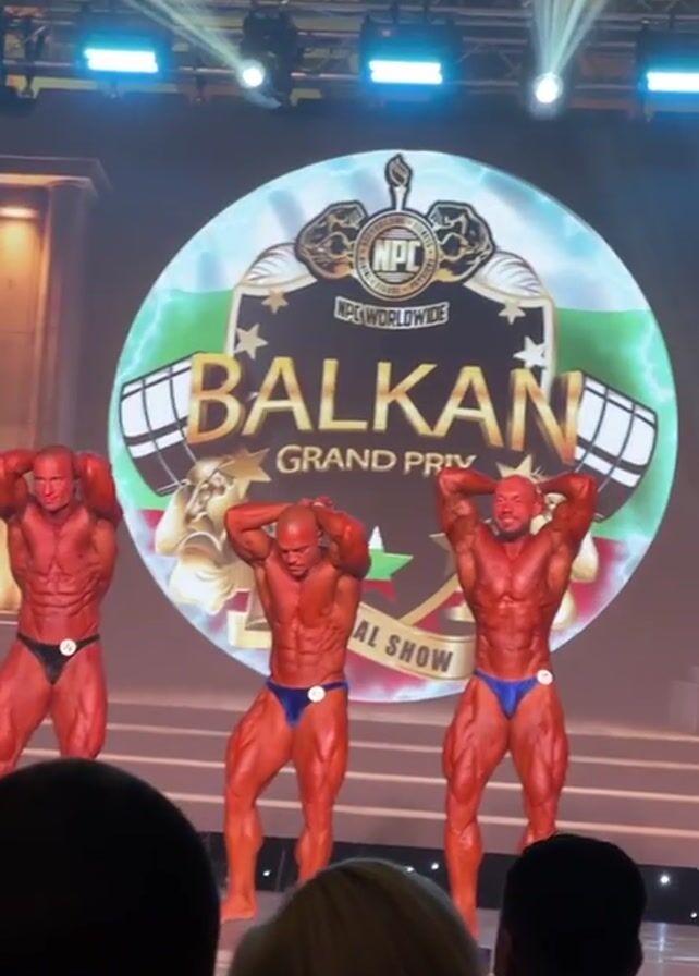 Three bald men are posing on a stage during a bodybuilding competition. They are tanned and wearing small bathing suits. Behind them, a large screen shows the words "Balkan Grand Prix" along with flags and logos. Lights illuminate the stage from above. An audience is visible in the foreground, with heads and shoulders appearing in silhouette.