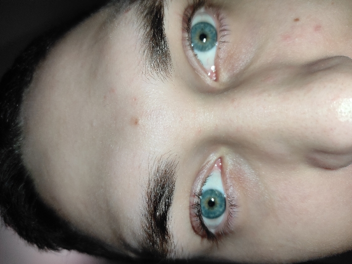 A close-up, frontal photographic image captures the upper portion of an individual's face, specifically the forehead, eyes, nose bridge, and upper cheeks. The subject exhibits light skin tone, dark hair at the top of the forehead, and prominent blue-green irises with dark, circular pupils. Dark, relatively thick eyebrows frame the eyes. Minor skin texture and several small blemishes or moles are visible on the forehead and right cheek. Direct lighting illuminates the face, creating slight reflections on the skin. The background is uniformly dark and featureless, providing no environmental context. The individual's gaze is directed towards the camera. No other subjects, objects, actions, or interactions are discernible within the frame. The scene is located in the city of Марковский, Russia.