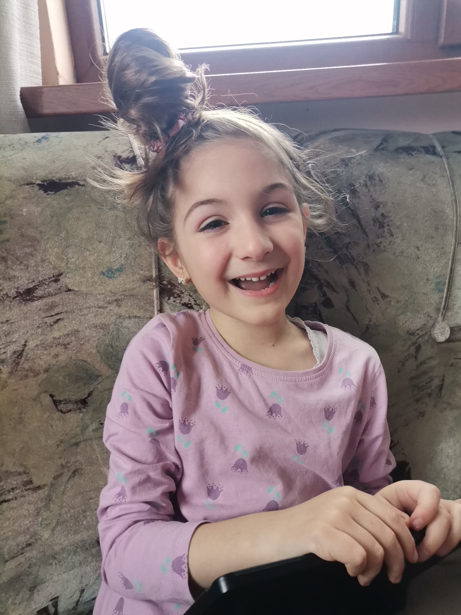 A young girl with light brown hair in a high bun is sitting on a patterned sofa. She is wearing a long-sleeved purple shirt with a tulip pattern. She is smiling and laughing with her mouth open. She is holding a black object in her hands. The background includes a window with a wooden frame and a curtain. The location is Obrochishte, Bulgaria.